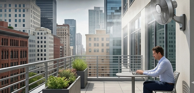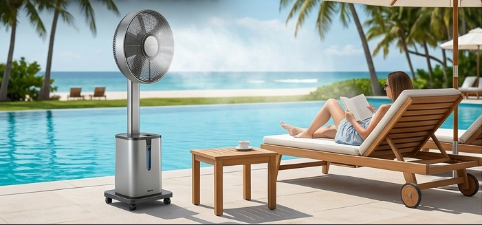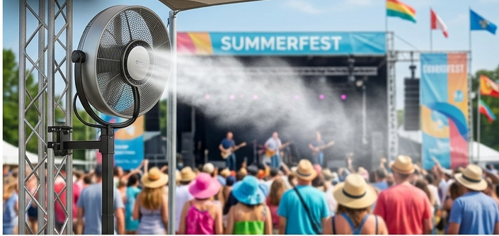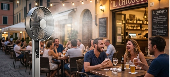 Ventilatori nebulizzatori per dehor, terrazze, ristoranti, bar ed eventi all'aperto. Raffrescamento immediato, senza installazioni complesse.